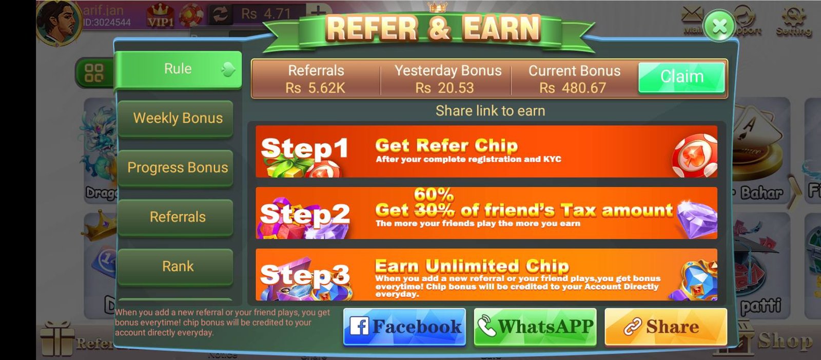 The platform focuses on real cash gameplay, where players deposit money, play games, win chips, and withdraw their earnings. It also provides bonuses, referral rewards, and VIP perks, making it suitable for both casual and serious players.