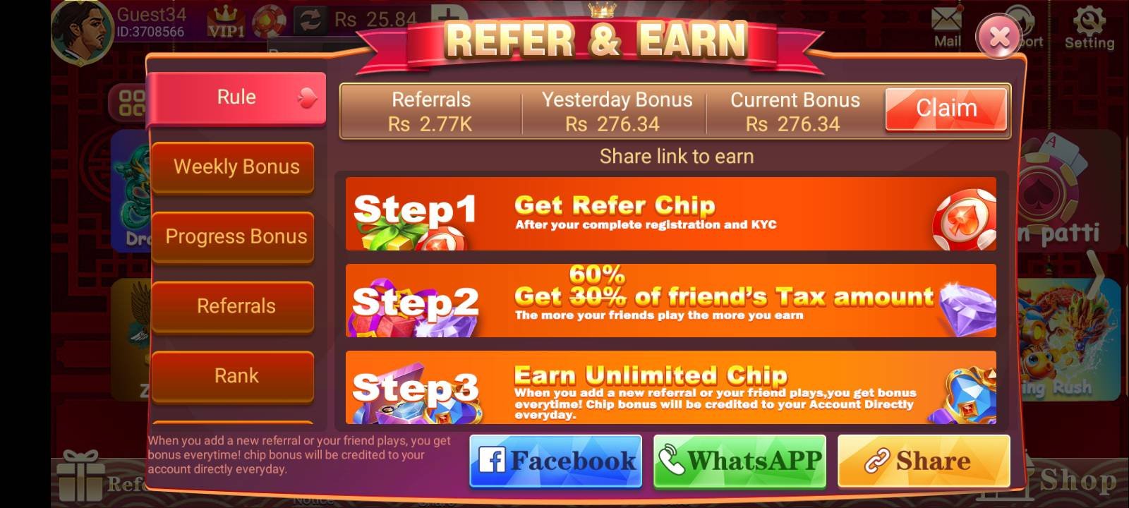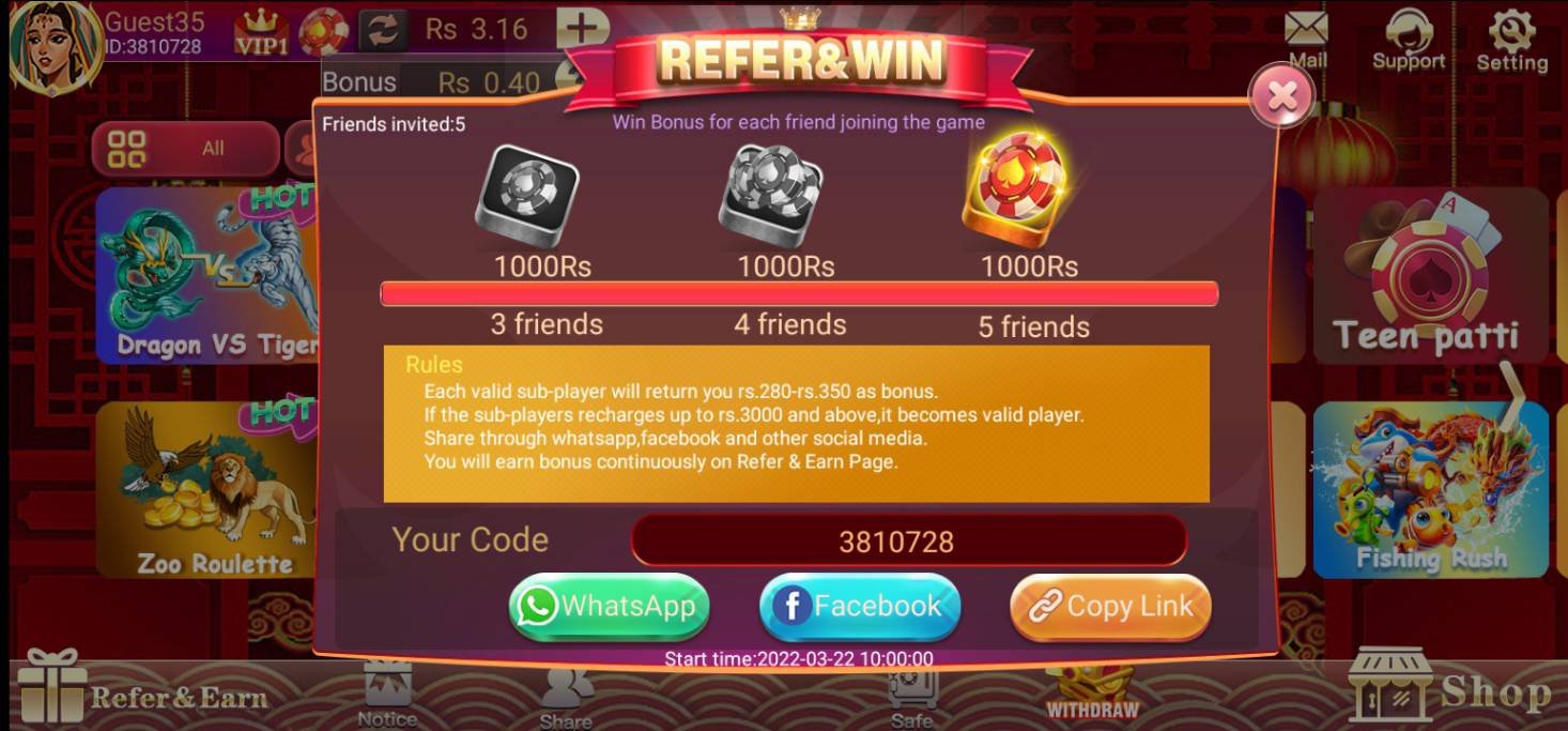 Each game allows you to use chips (coins) to place bets and win real money. The more you play and win, the more you can earn. Games like Dragon vs. Tiger and Teen Patti have high winning potential with the right strategy.